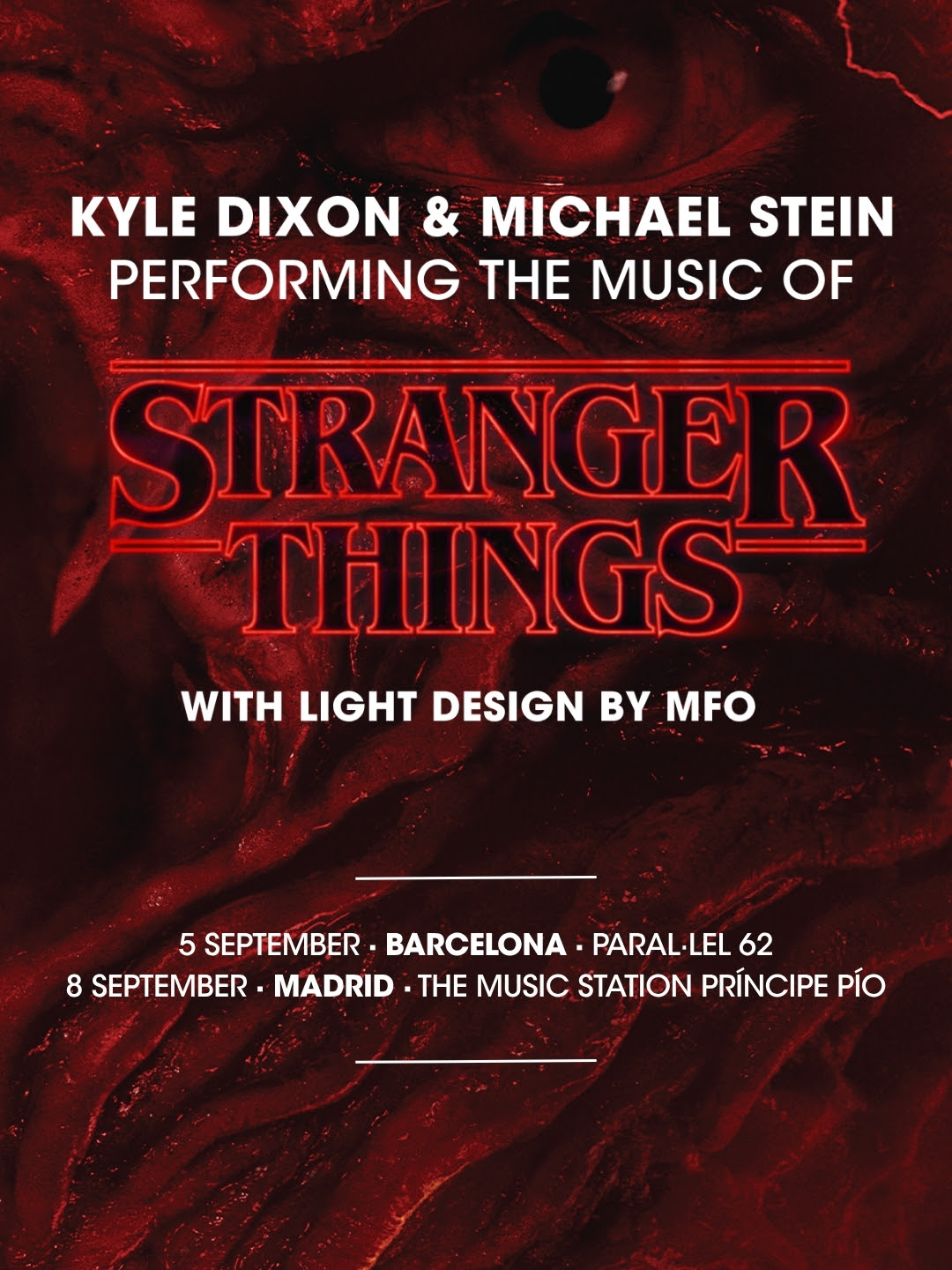 La plataforma musical Lapsus tiene el placer de anunciar la presentación exclusiva de los dos únicos conciertos en España: el 5 de septiembre en Paral·lel 62 (Barcelona) y el 8 de septiembre en The Music Station Príncipe Pío (Madrid), dos citas imprescindibles para vivir esta experiencia en directo. Para esta ocasión tan especial, Dixon y Sein se han asociado con el reconocido artista visual Marcel Weber (MFO). El nuevo espectáculo apuesta por un diseño minimalista y efectivo, utilizando la luz y la niebla para difuminar la línea entre el concierto y el cine y convertir la atmósfera de Stranger Things en una experiencia verdaderamente tangible.